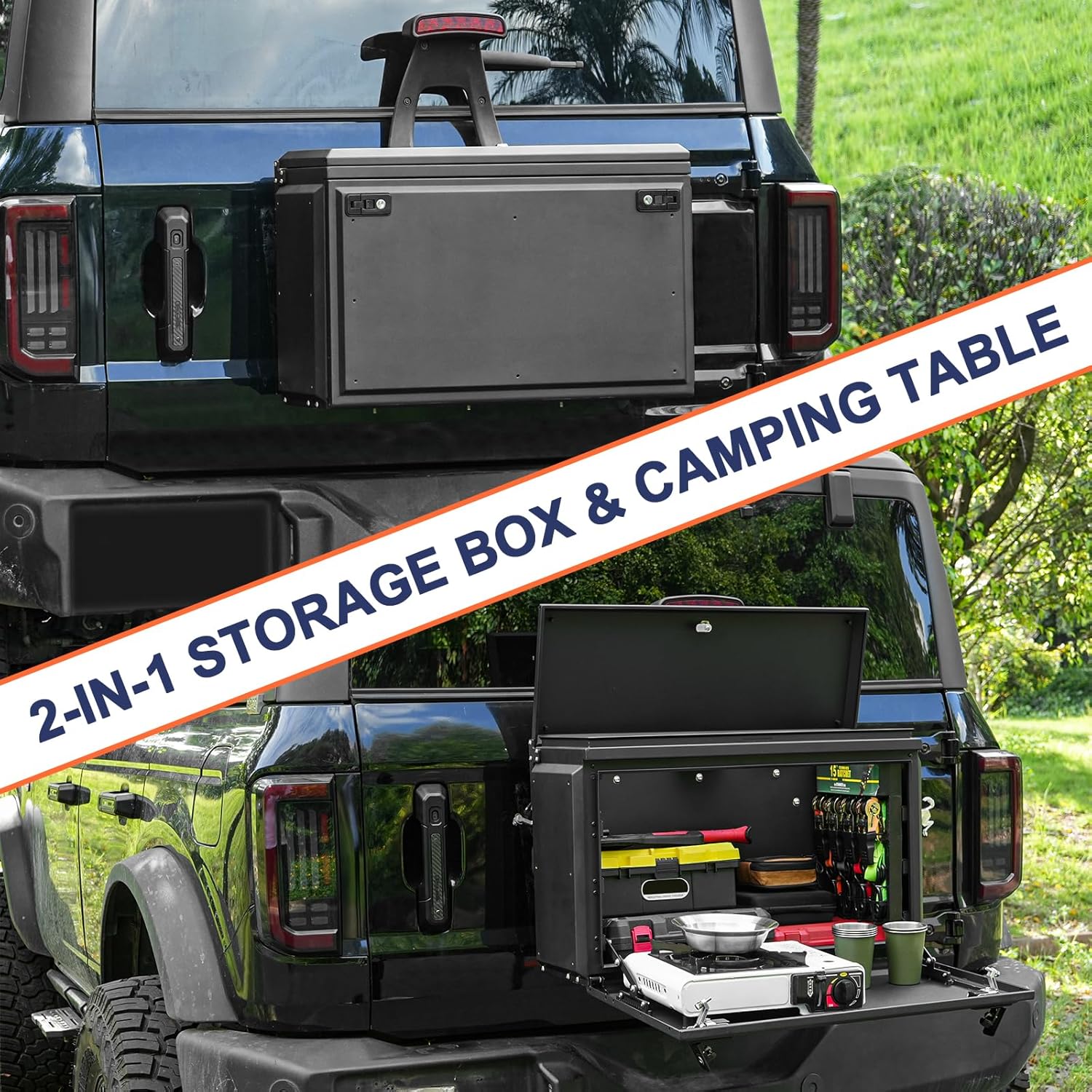 MAIKER Tailgate Table Storage Lock Box Compatible with 2021-2024 Ford Bronco 4 Door, Multi-Functional Rear Foldable Table Cargo Shelf Storage Waterproof Camping Desk (Not Fit Sport)