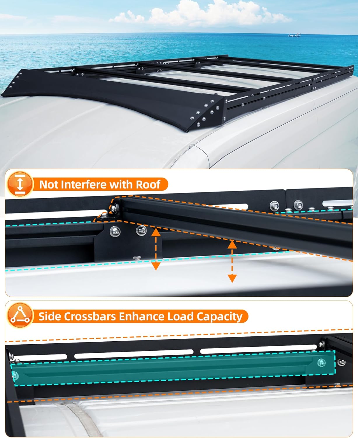 RUST PREVENTION: Side rails and crossbars are constructed from lightweight aluminum with black powder-coated, lightweight and sturdy. The footers and hardware are stainless steel, no need to worry about rusting. The rubber footer gaskets and rubber sealing washers will keep the roof of your van watertight