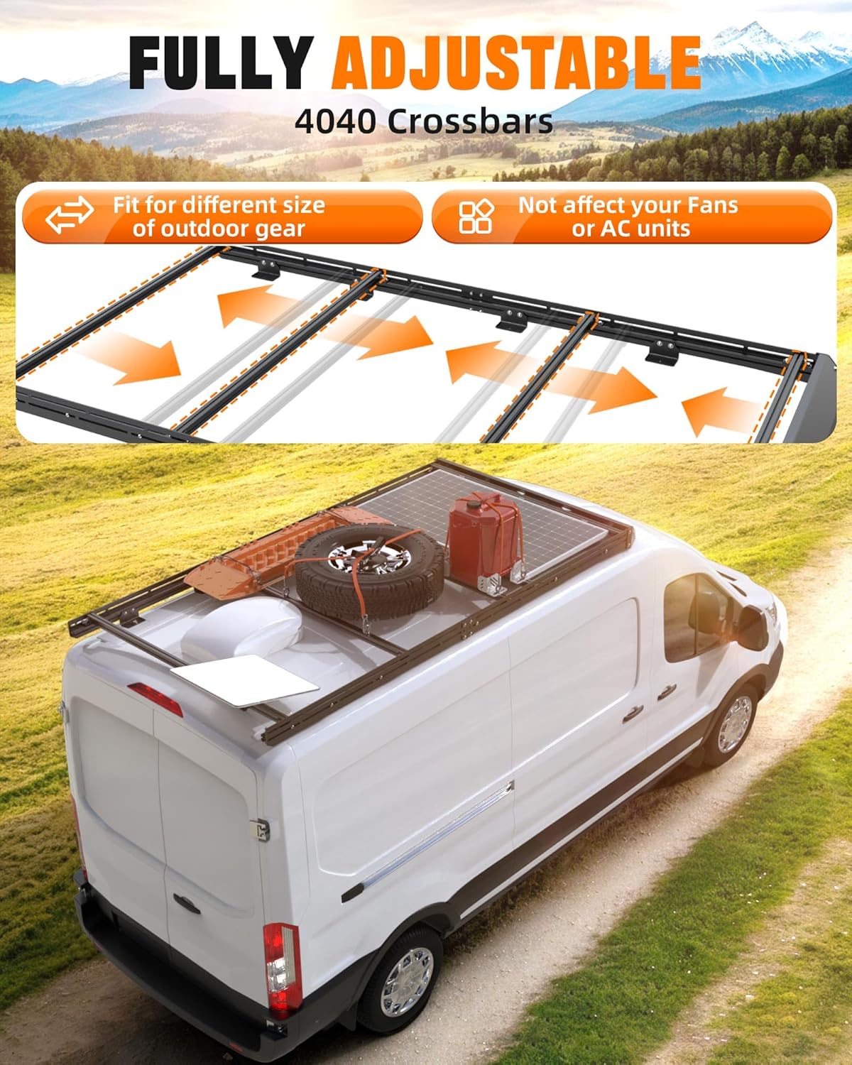 4040 CROSSBARS: Sidebars and crossbars are all bars with T-slot channels for maximum versatility and flexibility. You can position the crossbars exactly where you need them without affecting Fans or AC units, such as solar panels, starlink for RVs, awnings, surfboards and kayaks, etc