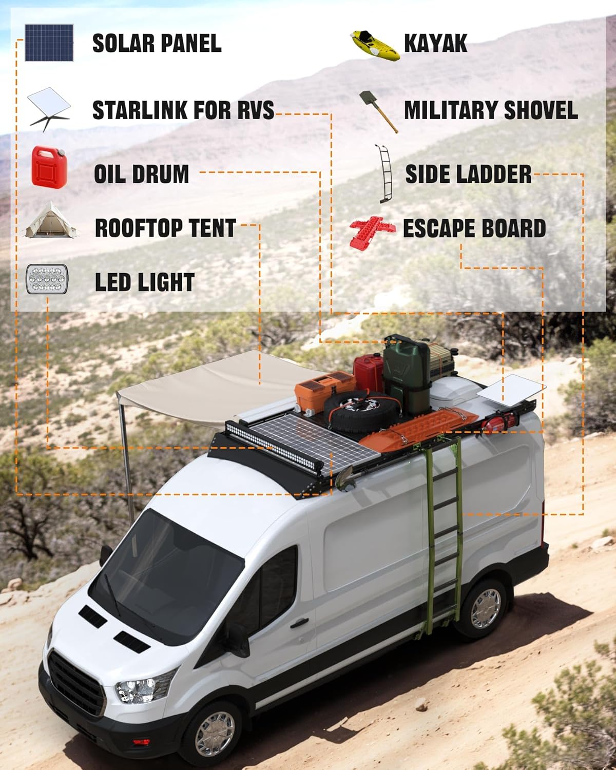 HIGH LOAD CAPACITY: Camper van roof rack with 8pcs high-strength steel mounting base, 4pcs aluminum extrusion crossbars and 4pcs reinforced side bars, ensuring 300lbs in dynamic, 500lbs in static