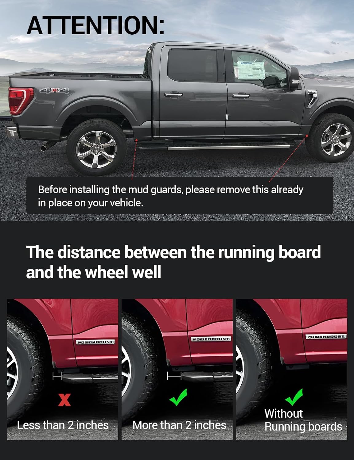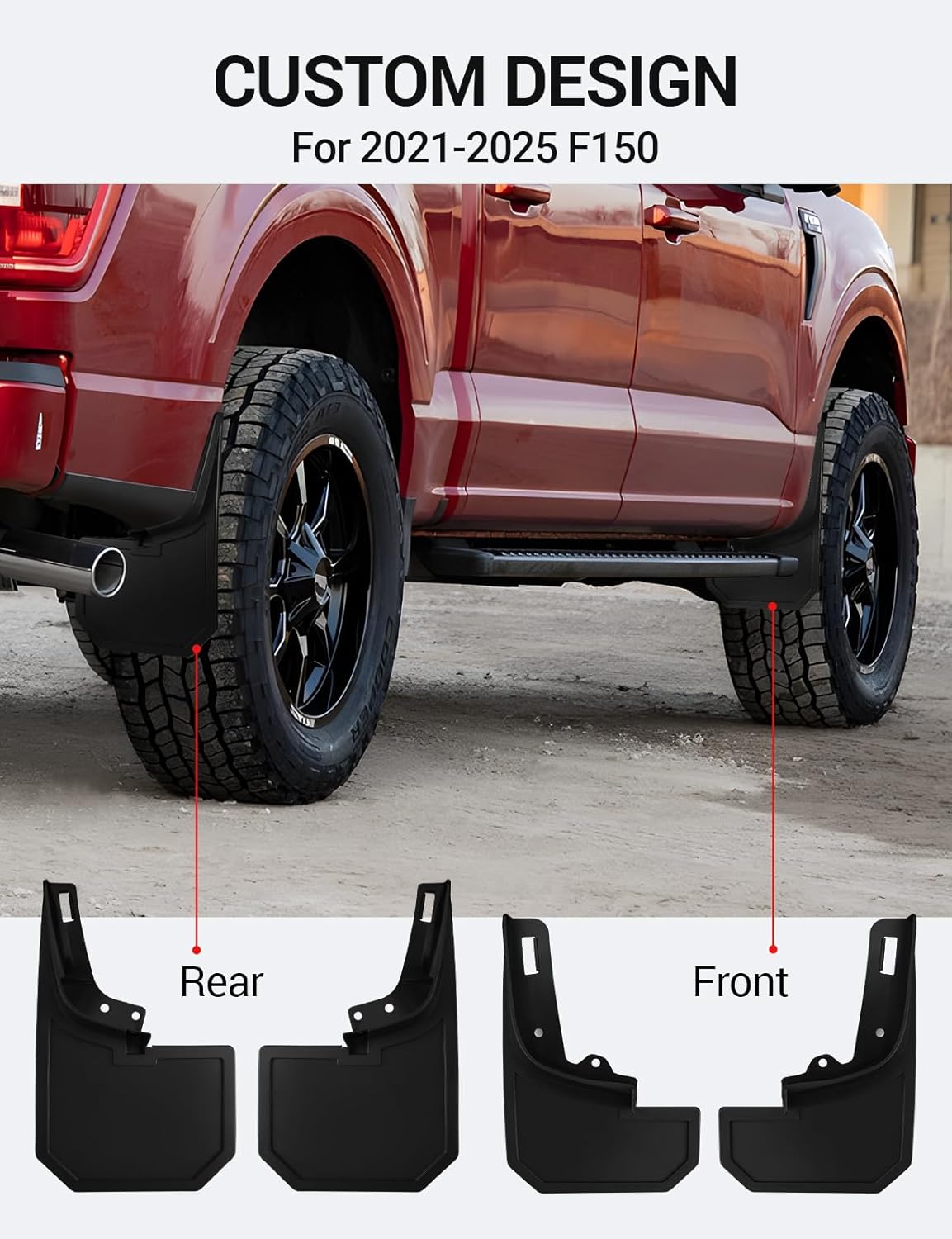 PATENT DESIGN: The 2021 2022 2023 f150 mud guards (for both left and right side) with the newest design. All-weather guard design, can ensure 100% safety in all weather (rain, fog, snow, etc).
