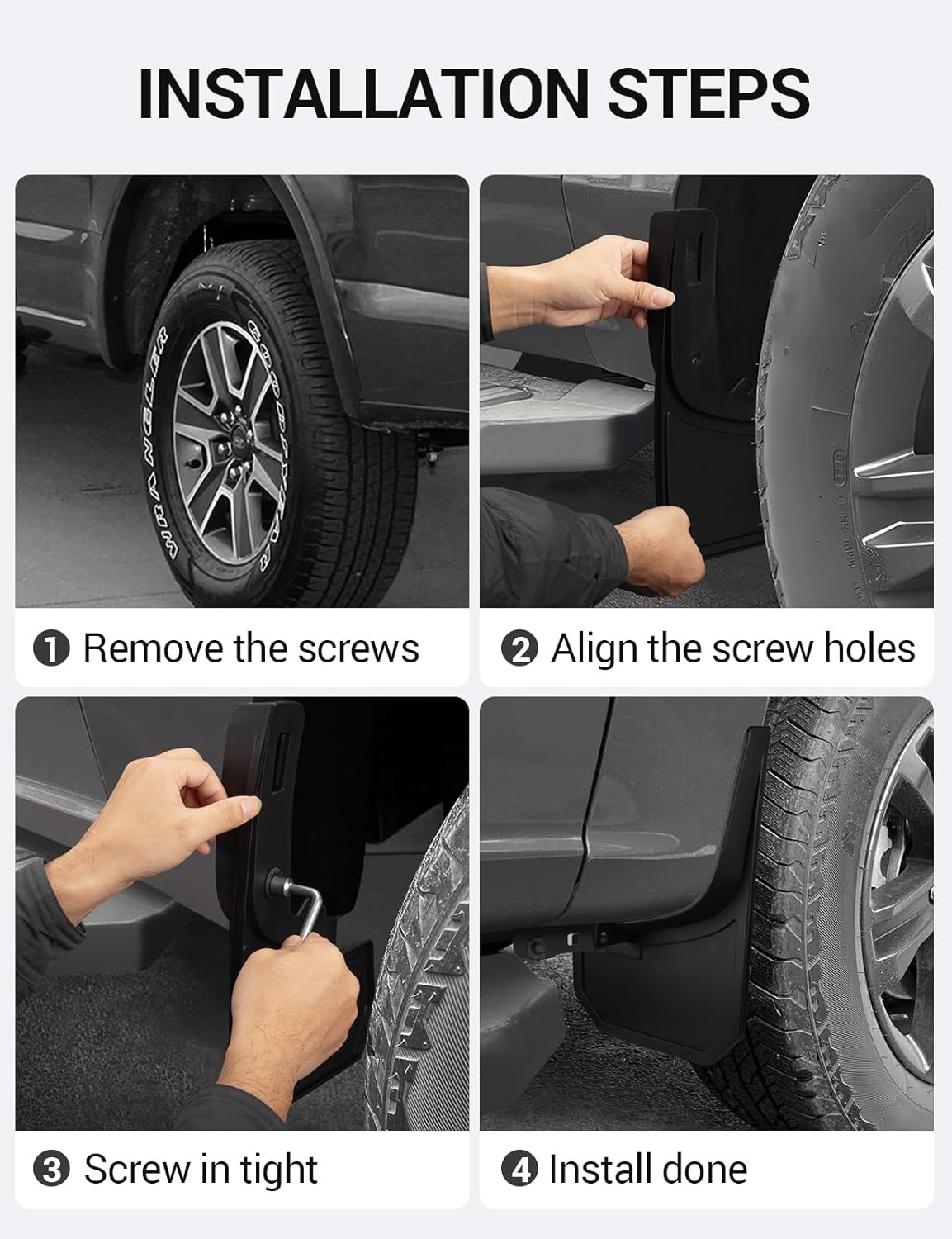 Easy To Install: No need to remove the wheels, drill holes, or sticky strips. The hole position on mud guard corresponds to F150. Just align the holes and screw in the screws.