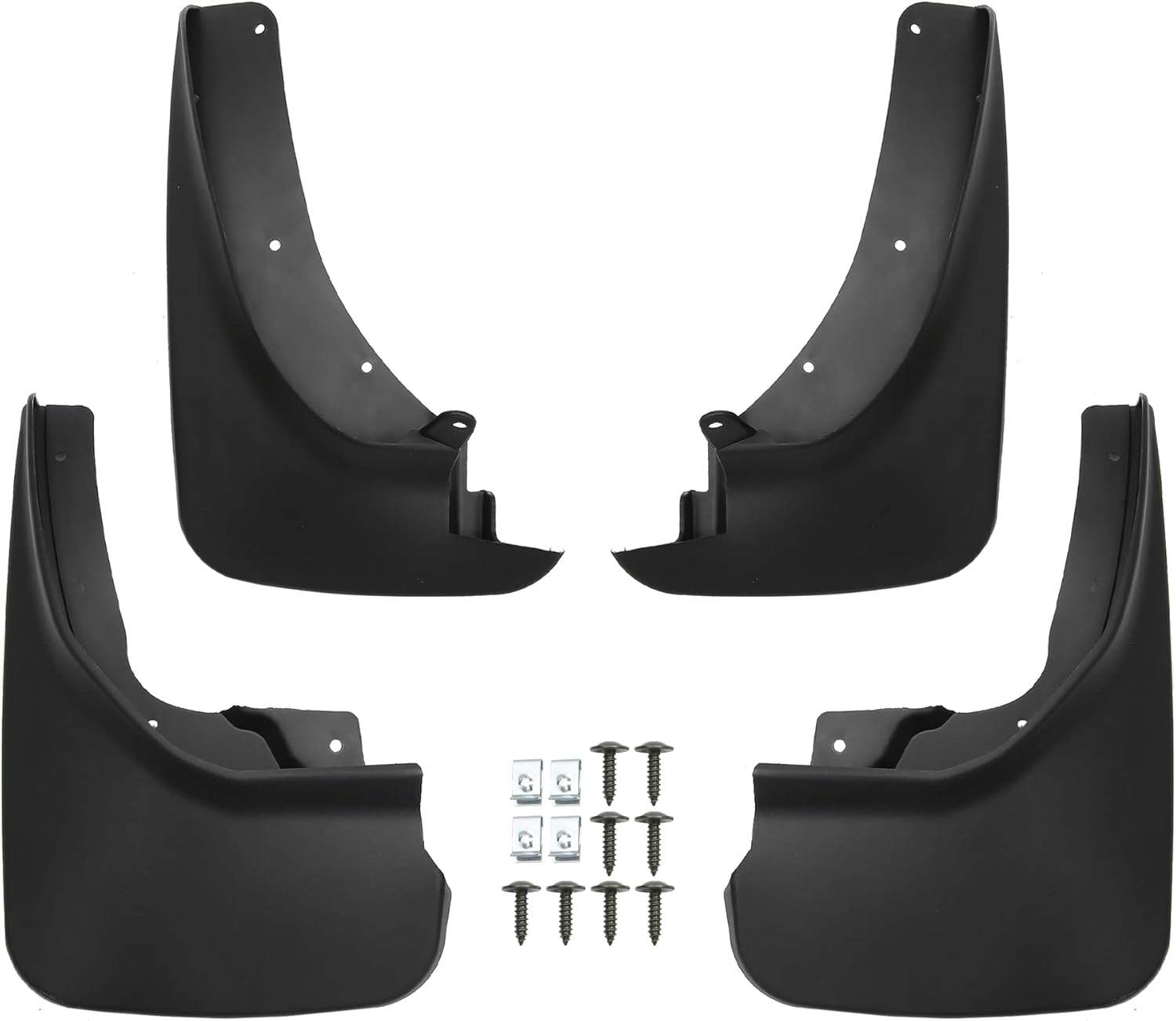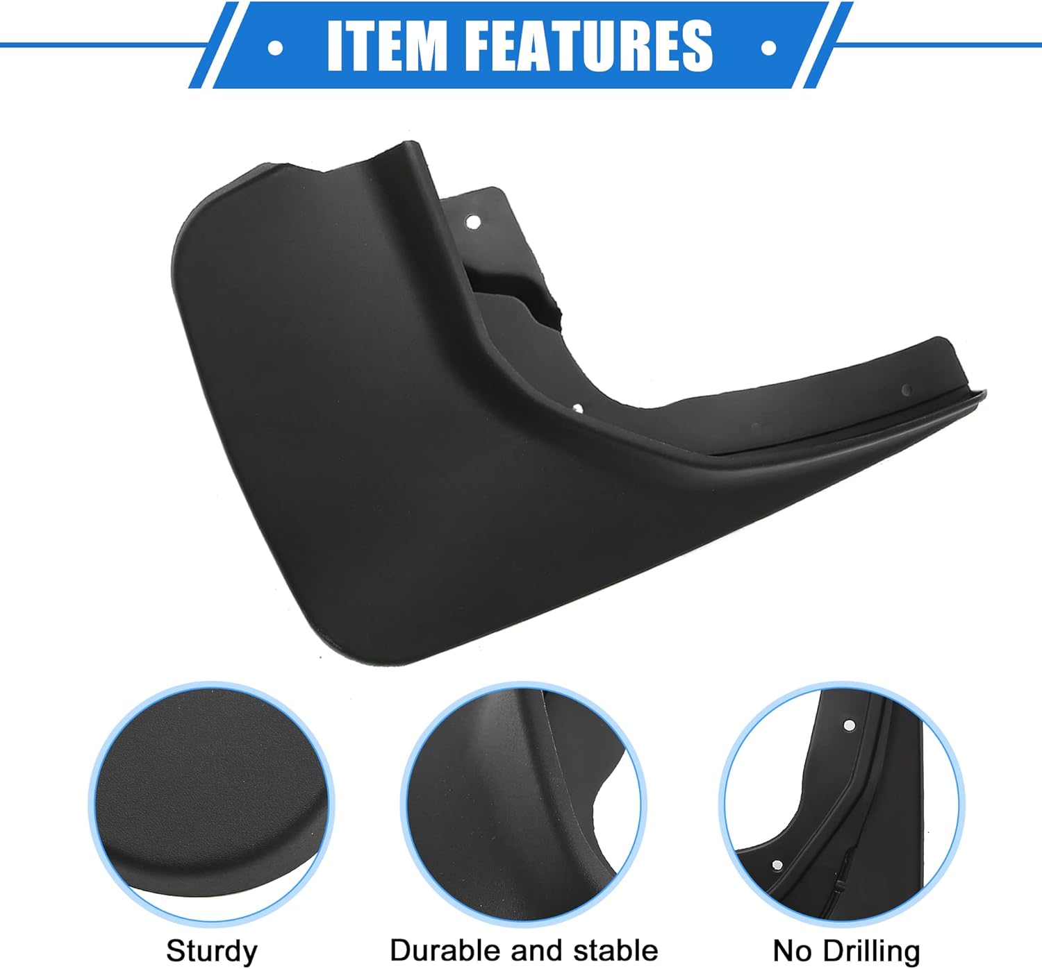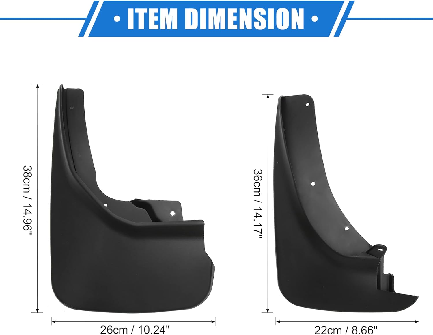 Product Color: BlackProduct Material: PlasticInstallation: Front and RearFitment Type: Pre-Drilled, Direct-FitNumber of One Set: 4Front Mud Flaps Size: 36x22cm / 14.17″x8.66″(L*W)Rear Mud Flaps Size: 38x26cm / 14.96″x10.24″(L*W)