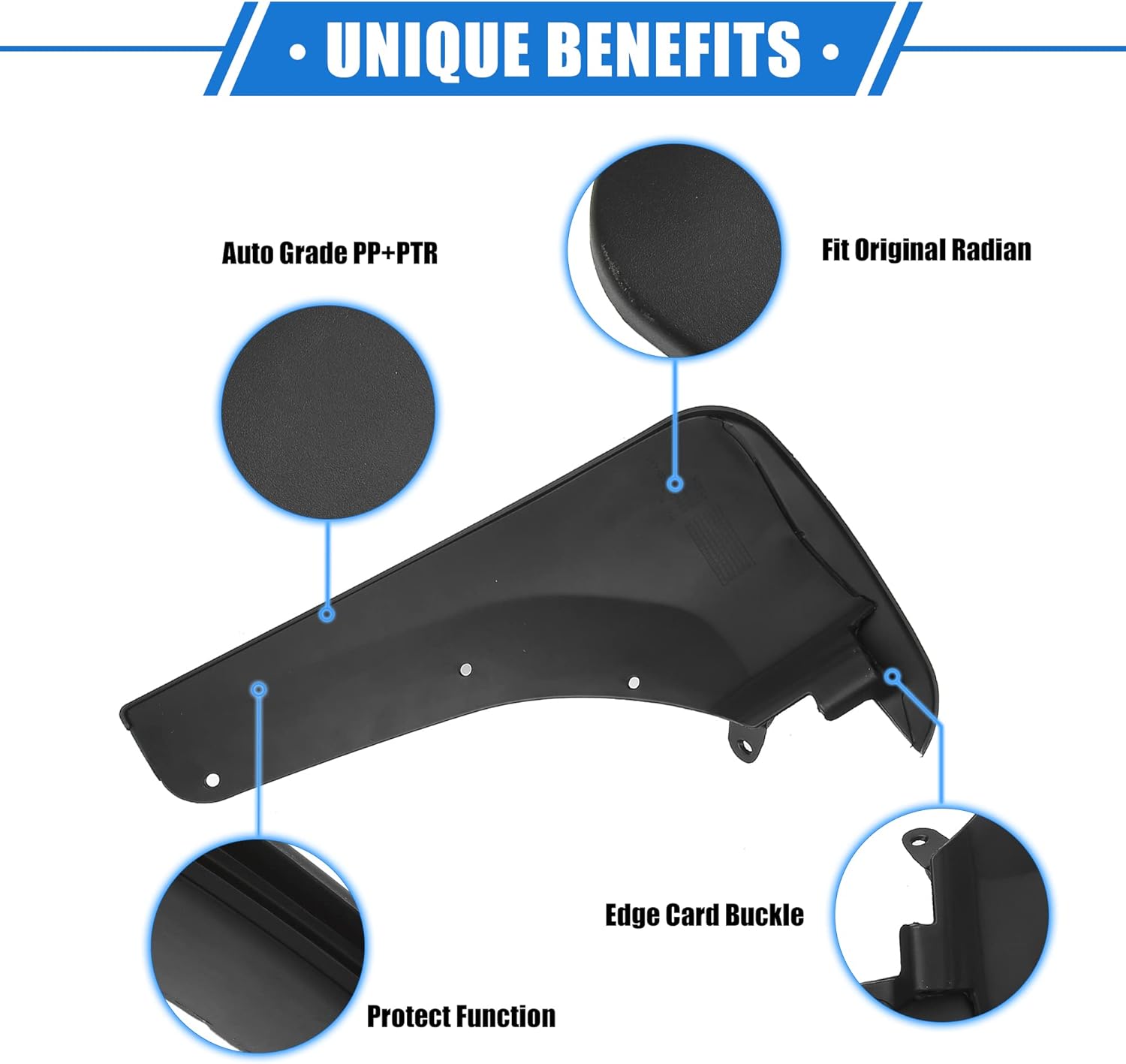 Prevent mud, dirt, and water from splattering against your door or fender.Mudguards are made to be as wide as possible to cover as many times as possible. We took care to ensure that the mudguards would not protrude or obstruct your turning.Every mudguard is a good fit for your car. A remarkable fit is ensured by the design’s ability to hug the contours of your vehicle like no other.For your peace of mind, the products are factory quality tested. Water, dirt, and rocks are no match for our guards. Also, even in the harshest, sunniest settings, our mudguards won’t fade.