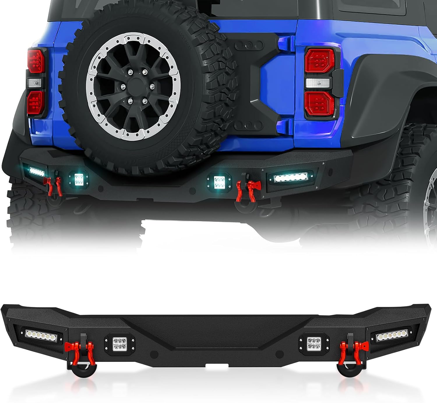 Rear Bumper Compatible with 2021-2025 Ford Bronco (NOT for Bronco Sport or Raptor) Off-Road Bumper with Paintable Armor, Sensor Holes, 4 x 18W LED Lights & D-rings (2/4 Doors, Black)