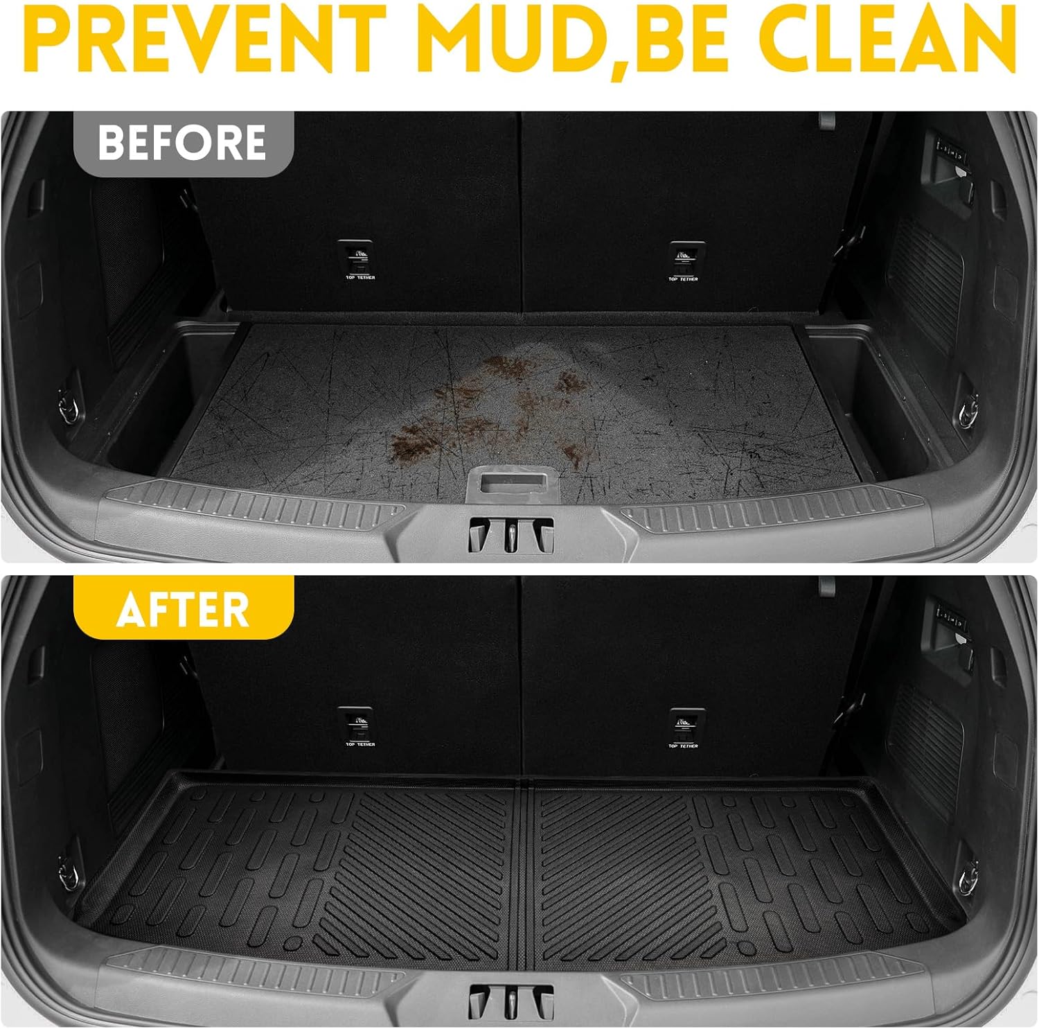 【Non-Slip&Easy to Clean】The rear cargo liner features a non-slip ribbed surface to prevent cargo shifting. Whether it is dust, dirt or sand on the mat, it only takes a few minutes to clean it with clean water or a damp towel.