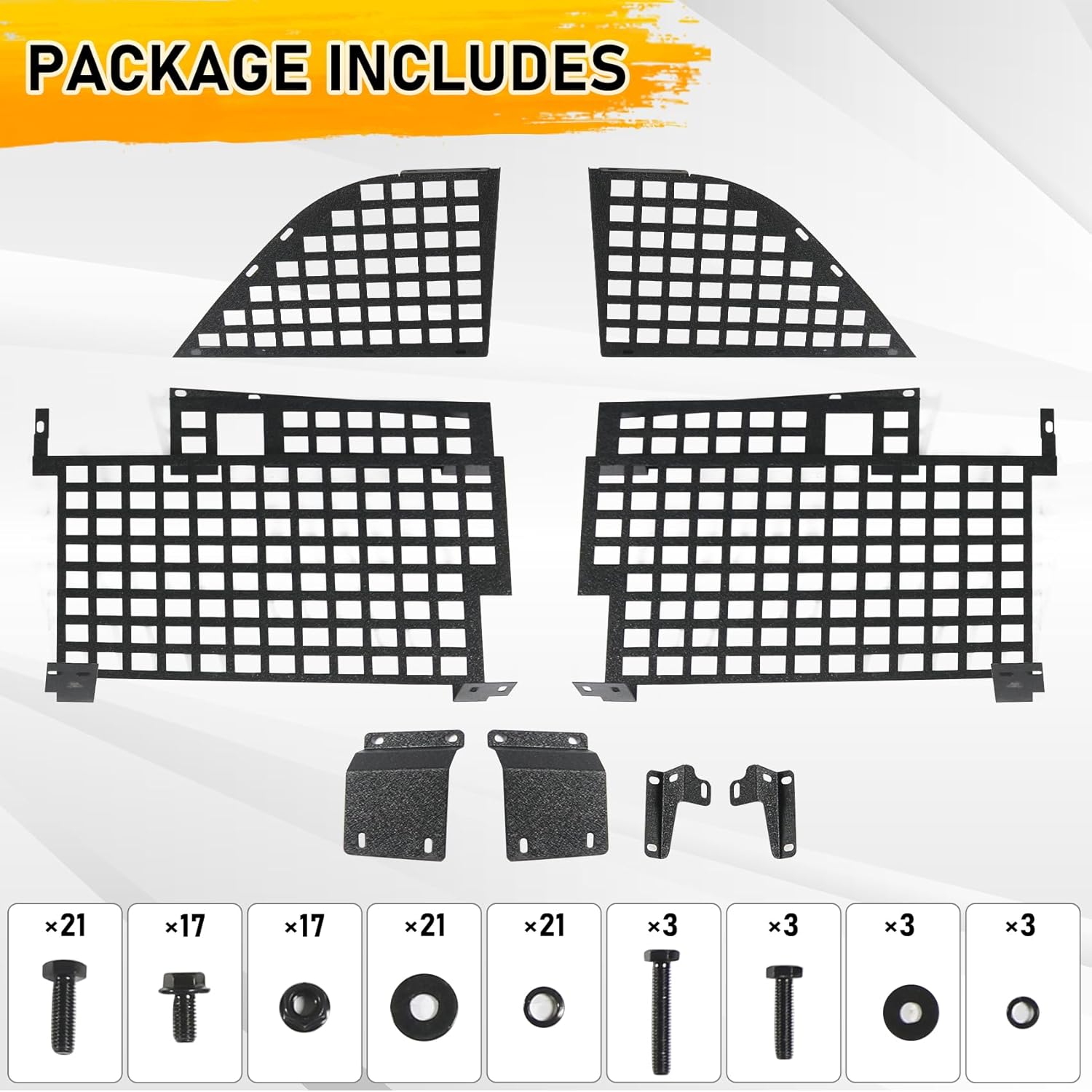 Package Include: 2 pcs left and right molle panel + 2 pcs left and right window molle panel+ all hardwares