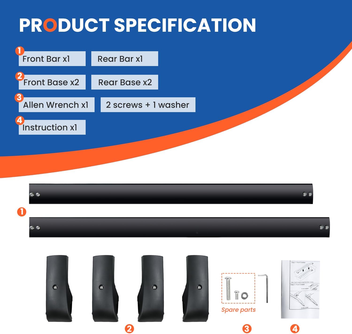 Easy Installation: Includes two crossbars (front and rear), four mounting bases, and all necessary installation tools. No drilling or cutting is required. Included instructions and Clear directions and markings on the product make it easy to install by yourself