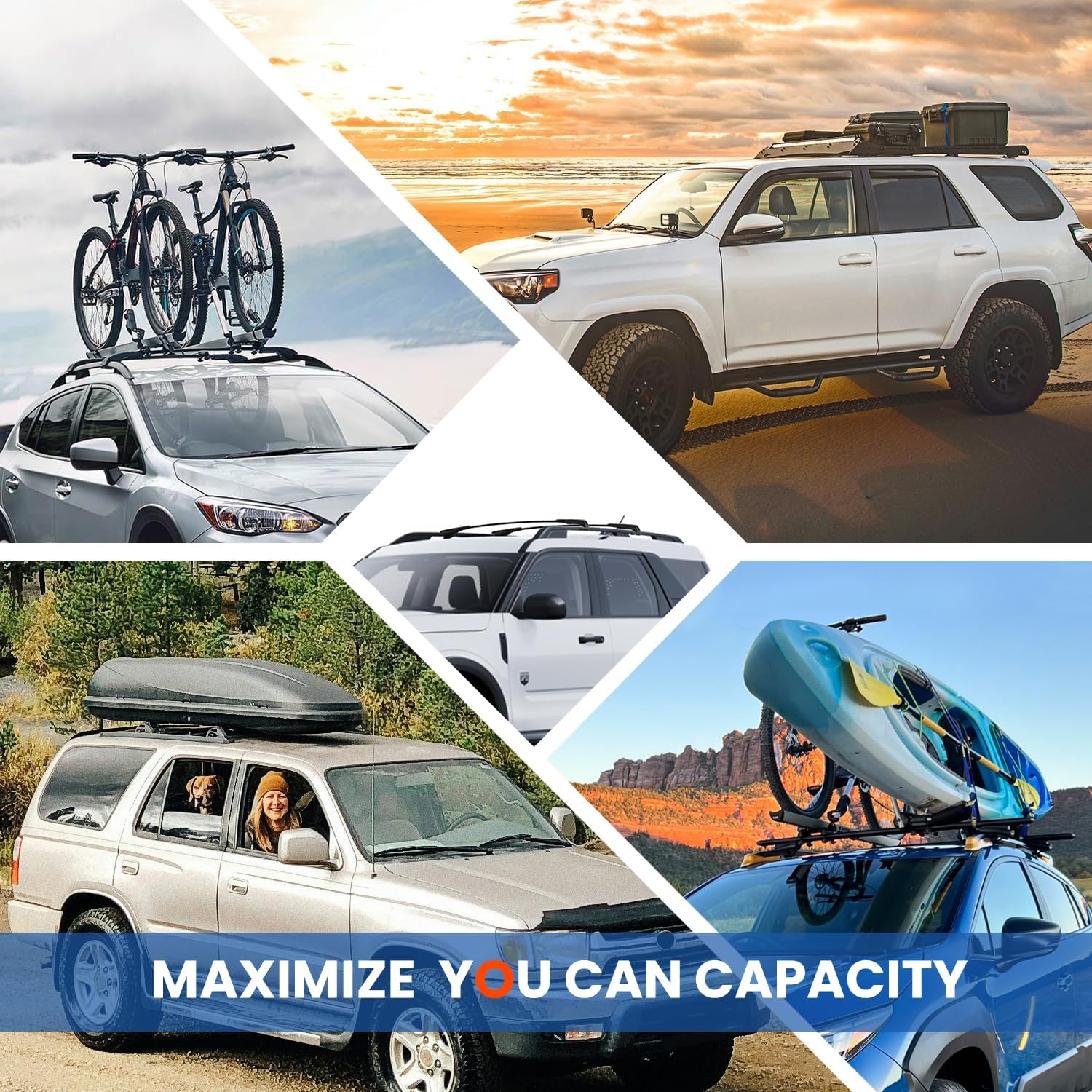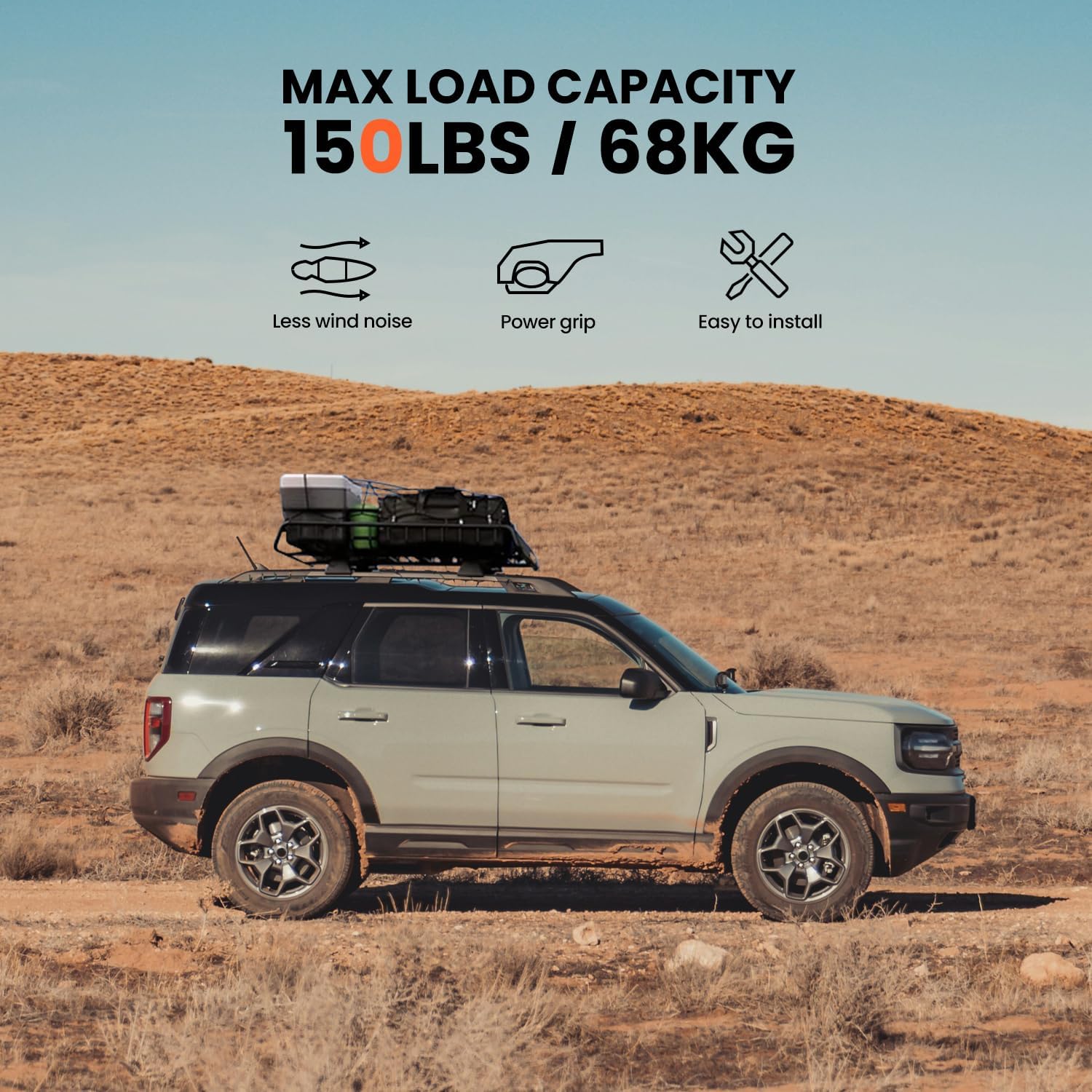 Max Load Capacity: Supports a maximum load of 150 lbs(68 kg) when the force is evenly distributed. Compatible with a variety of rooftop accessories including cargo carriers, bike racks, snowboards, roof boxes, roof bags, kayaks, canoes, and more