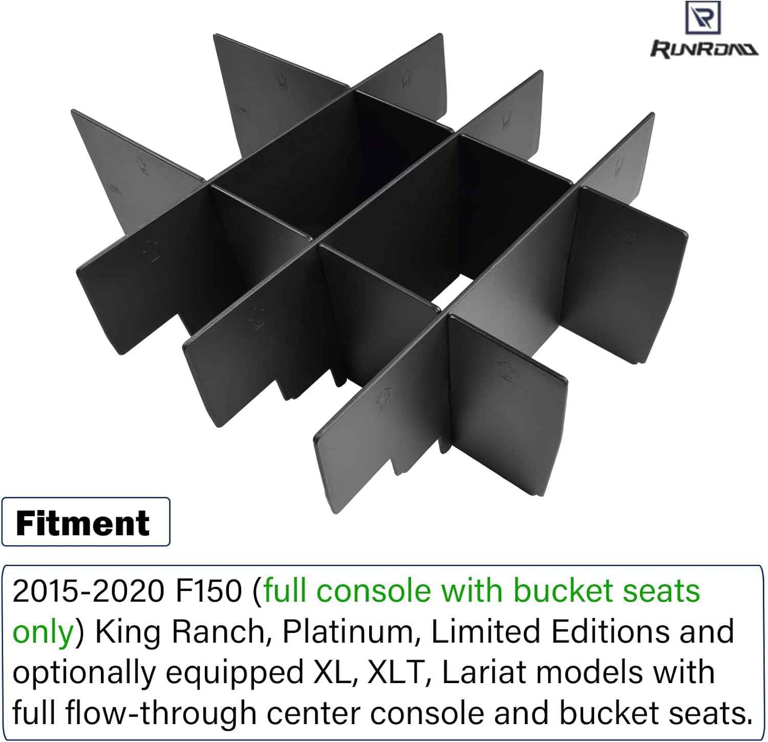[Fitment] – This RUNROAD center console organizer dividers fit (full console with bucket seats only) 2015-2020 F150, King Ranch, Platinum, Limited Editions and optionally equipped XL, XLT, Lariat models with full flow-through center console and bucket seats.