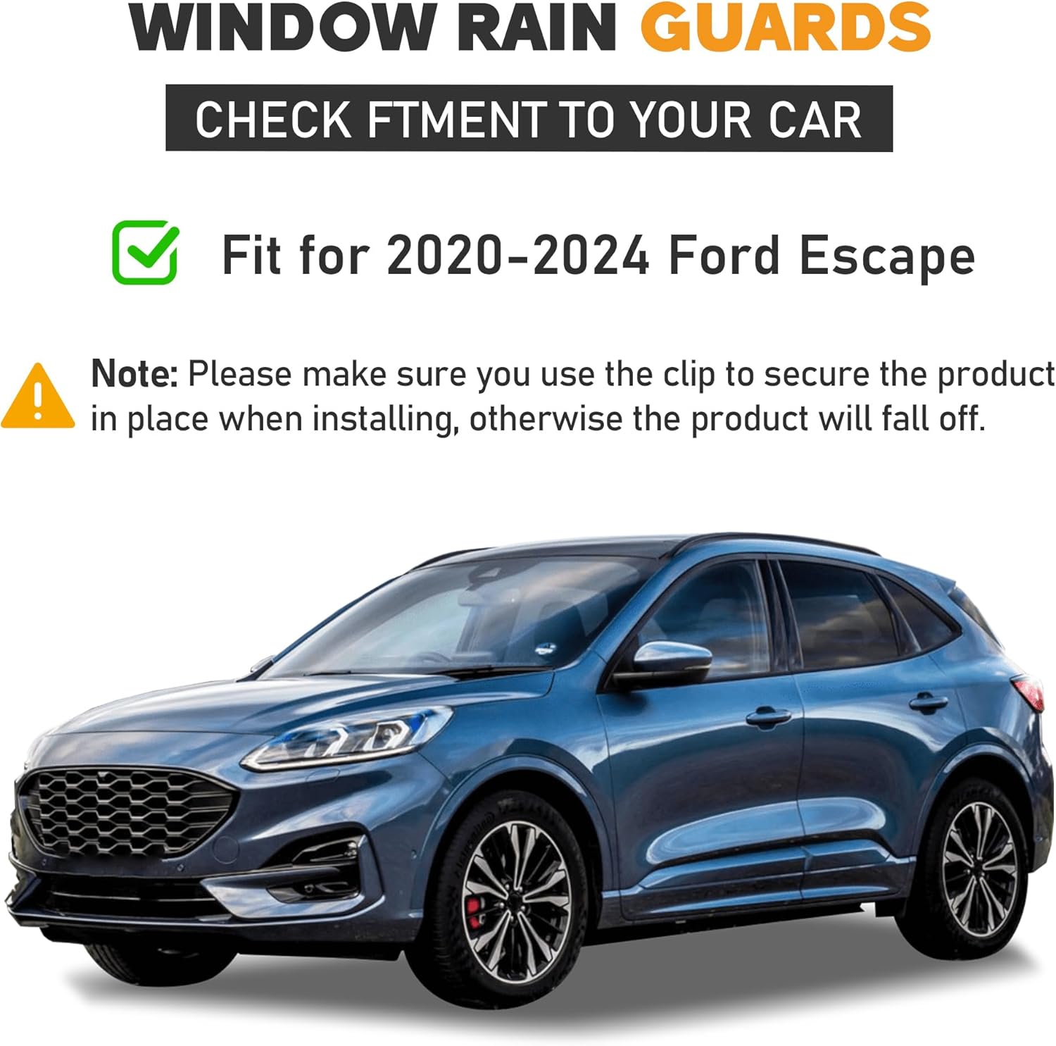 Applicable Vehicle Models: Vent deflector custom fits only for Ford Escape 2020 2021 2022 2023 2024 2025 window rain guards. Attention: Please apply the clip to fix the rain guards