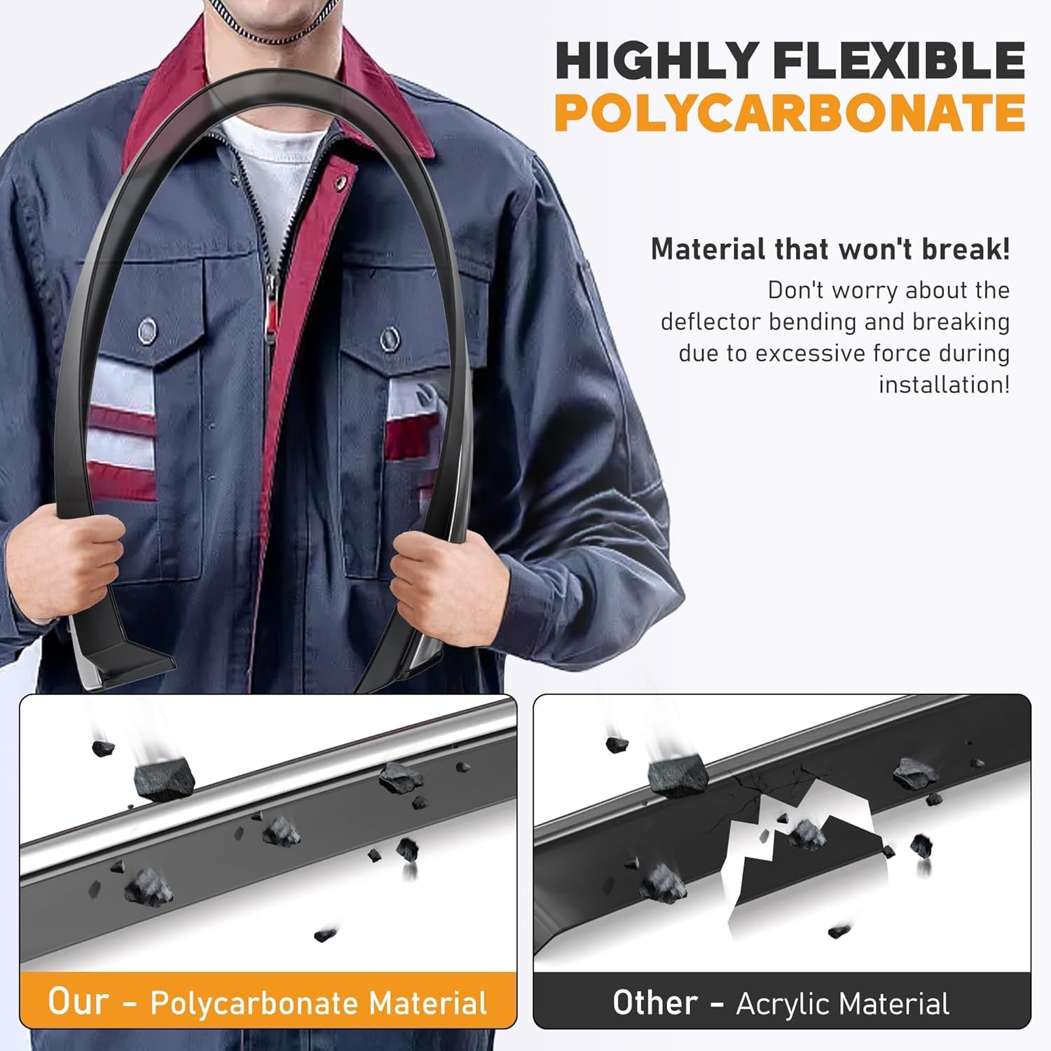 Polycarbonate Materials: HOPE YOU READY car window air deflectors are made with a shatterproof, ultra-strong, reinforced polycarbonate material. It is not as easily shattered as acrylic material