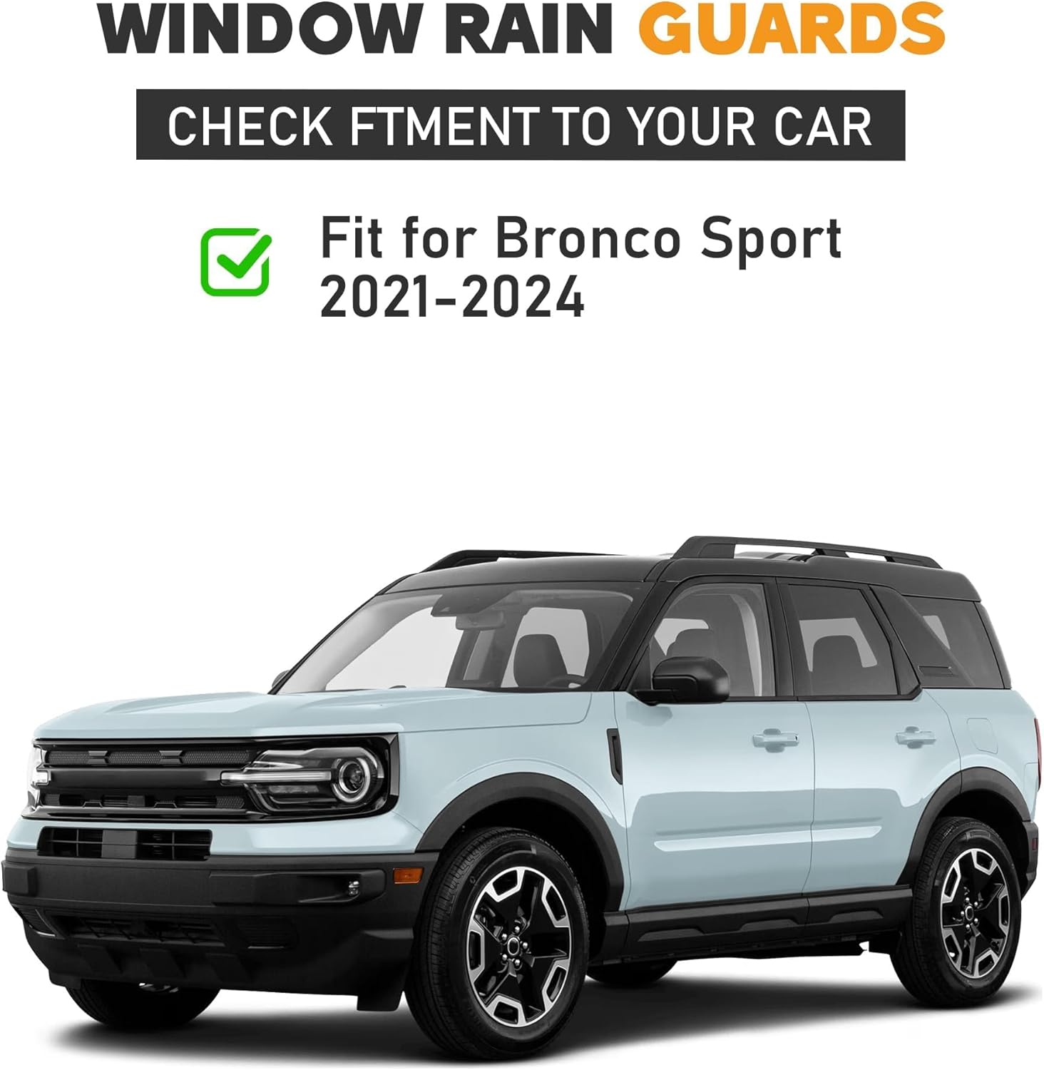 Applicable Vehicle Models: Vent deflector custom fits only for 2021 2022 2023 2024 Ford Bronco Sport window rain guards