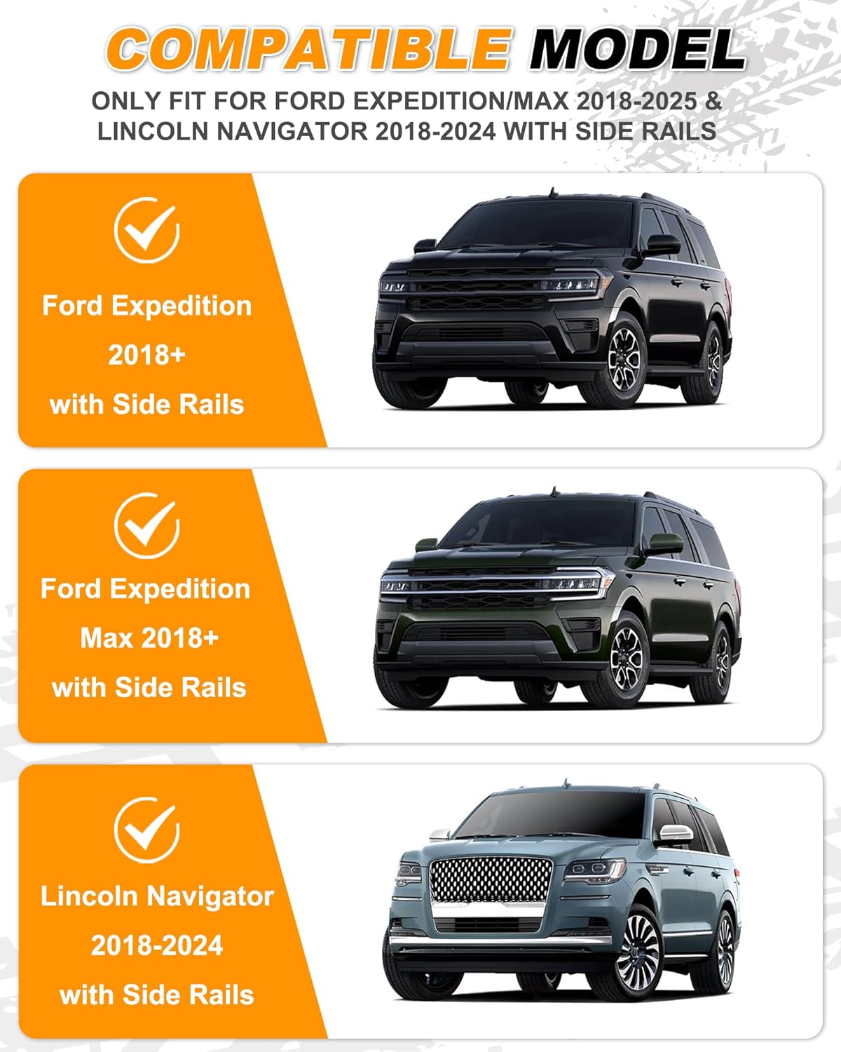 COMPATIBILITY: Roof rack cross bars are designed for Ford Expedition & Ford Expedition Max XL XLT Limited Timberline King Ranch Platinum 2018 2019 2020 2021 2022 2023 2024, Lincoln Navigator 2018 2019 2020 2021 2022 2023 2024 with side rails.