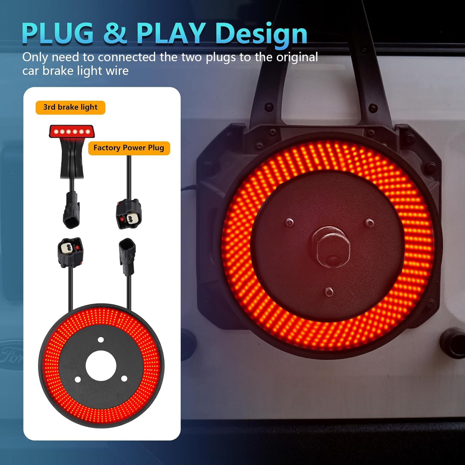 Upgraded Version:A total of 6 ring 405pcs super bright red LEDs, Our Ford Bronco spare tire brake light can not only provide higher red brightness and stronger penetration , effectively alerting an approaching vehicle behind your movement, even in inclement weather it will keep you safer while driving, also can play a role in decorating the trunk, making your car different and more eye-catching. (Please NOTE, Bronco spare tire light is NOT SUITABLE for Bronco Sport, Bronco Raptor and Sasquatch series)