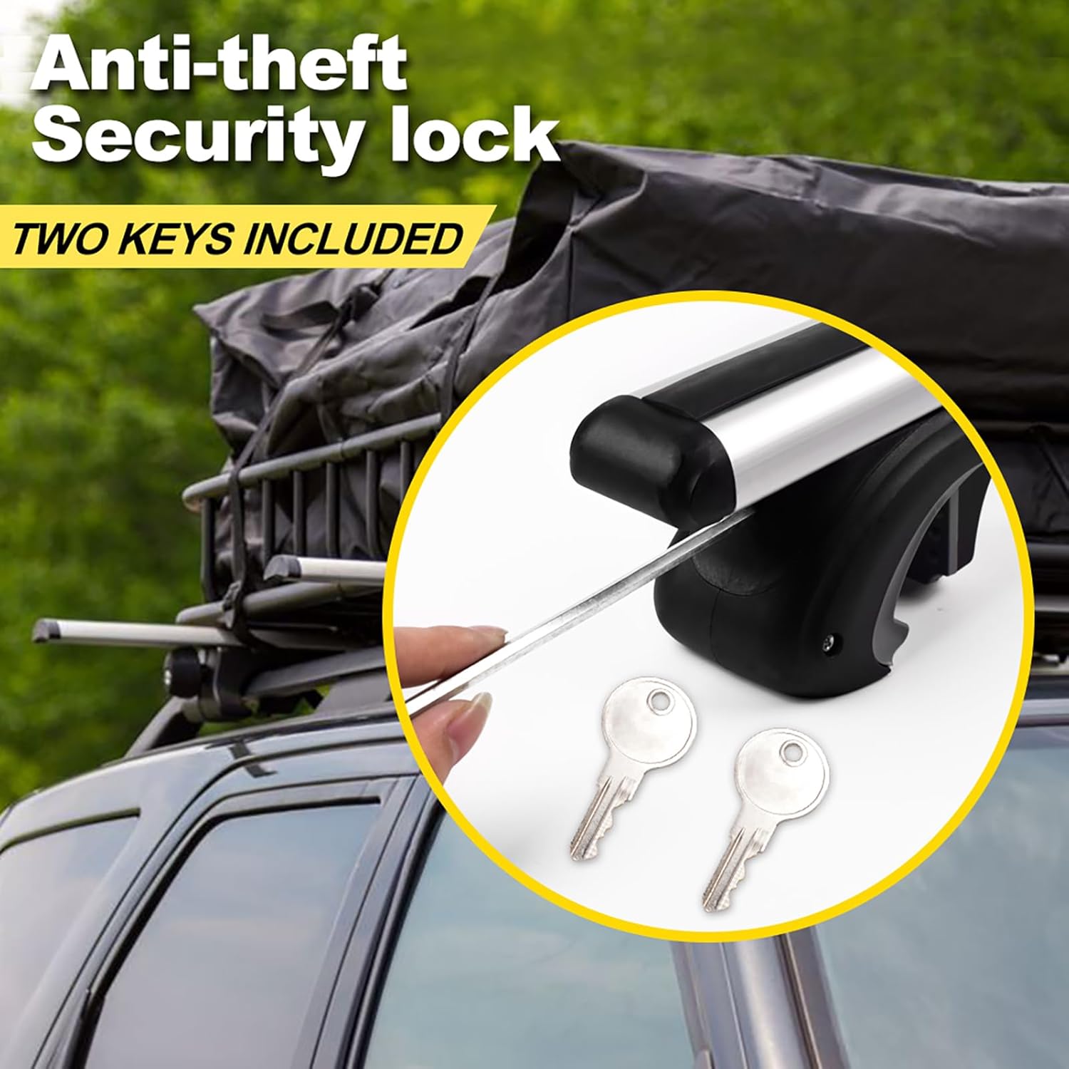 【EASY TO INSTALL】 :Each set of crossbar roof rack comes with the necessary installation tools, no need to assemble, refer to the instructions or our installation video to quickly complete the installation and removal. It is very convenient for you!Our crossbars roof rack comes with an anti-theft lock system and two keys. Once locked, it remains steady and secure