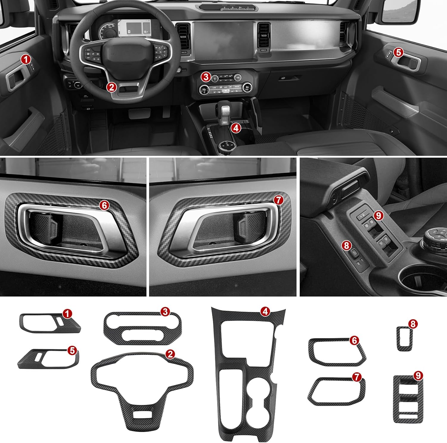 Perfect Fitment: The interior trim kit is compatible with Ford Bronco 4 Door 2024 2023 2022 2021, ensuring seamless alignment with gear shift panels, door handle bowls, and steering wheel trim. NOT FIT for Bronco 2-door models or manual transmission. Please confirm compatibility with your specific model before purchasing.