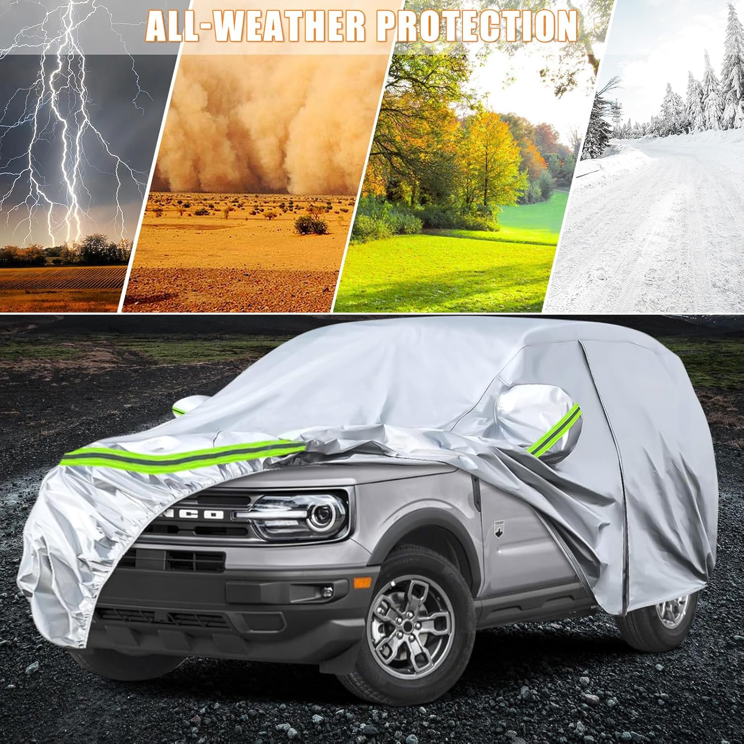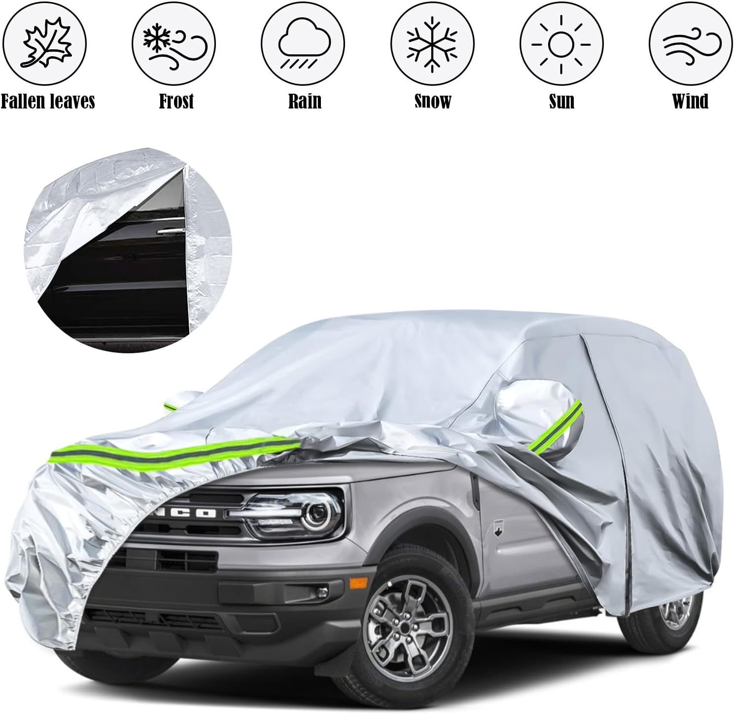 Compatible with: This Waterproof All Weather Full Car Cover Perfectly Fit for 2021- 2024 2025 Ford Bronco Sport. Fully protects your car like a mobile garage. If you think your car body dimension within 173(L)* 75(W)* 71(H) in, you can also use this car cover