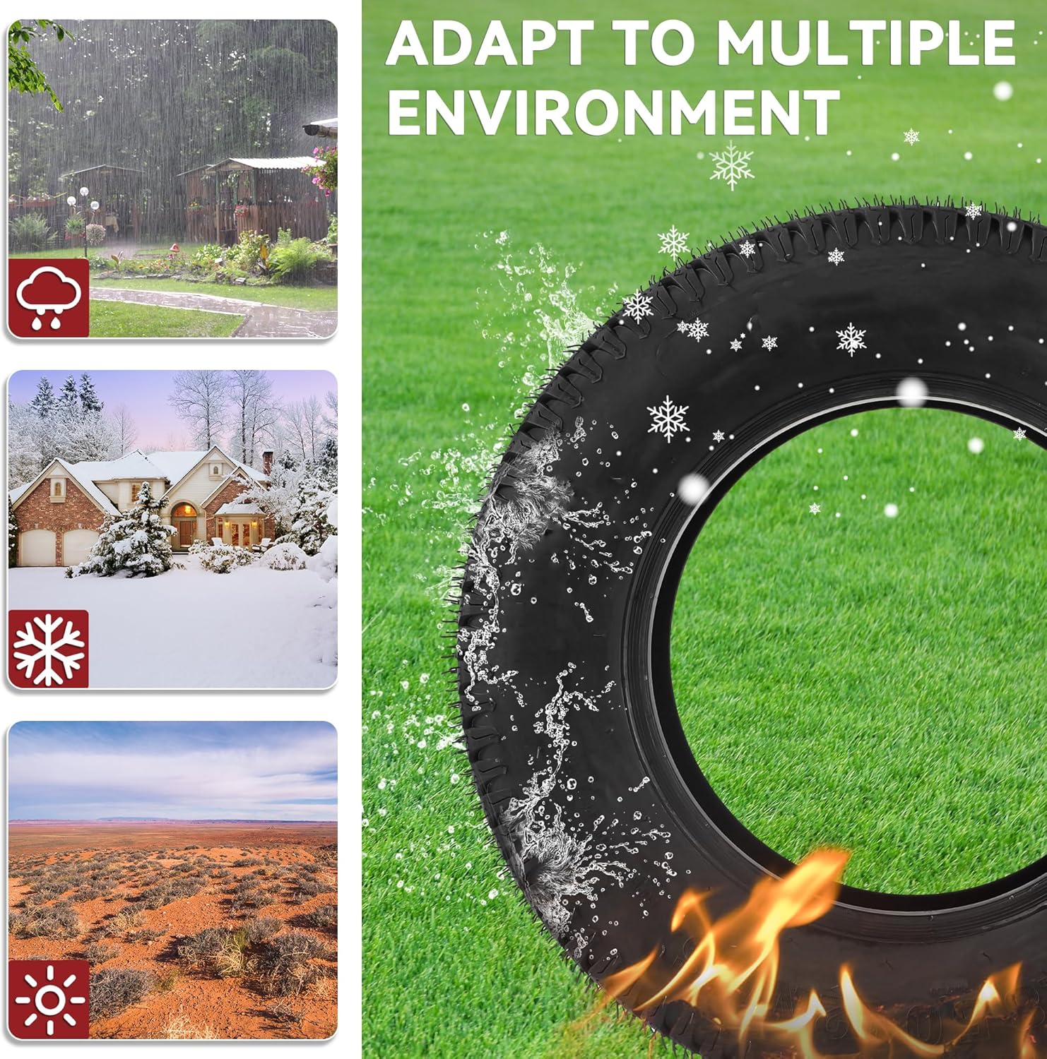 High Performance: Unique tread pattern design reduces lawn damage by increasing friction between the tire and ground; Also reduces tire noise and enhances the tire’s cooling and drainage capability to improve overall vehicle handling