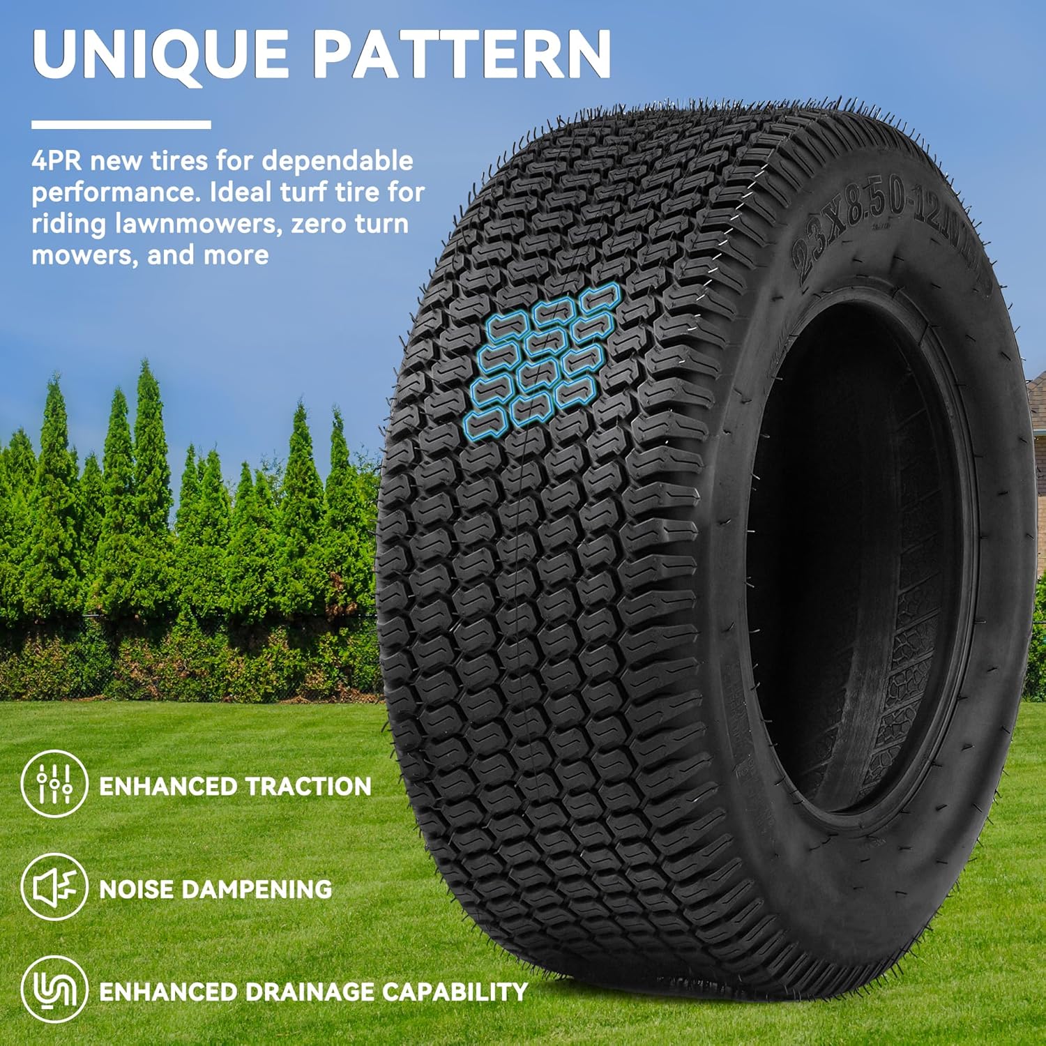 High Performance: Unique tread pattern design reduces lawn damage by increasing friction between the tire and ground; Also reduces tire noise and enhances the tire’s cooling and drainage capability to improve overall vehicle handling