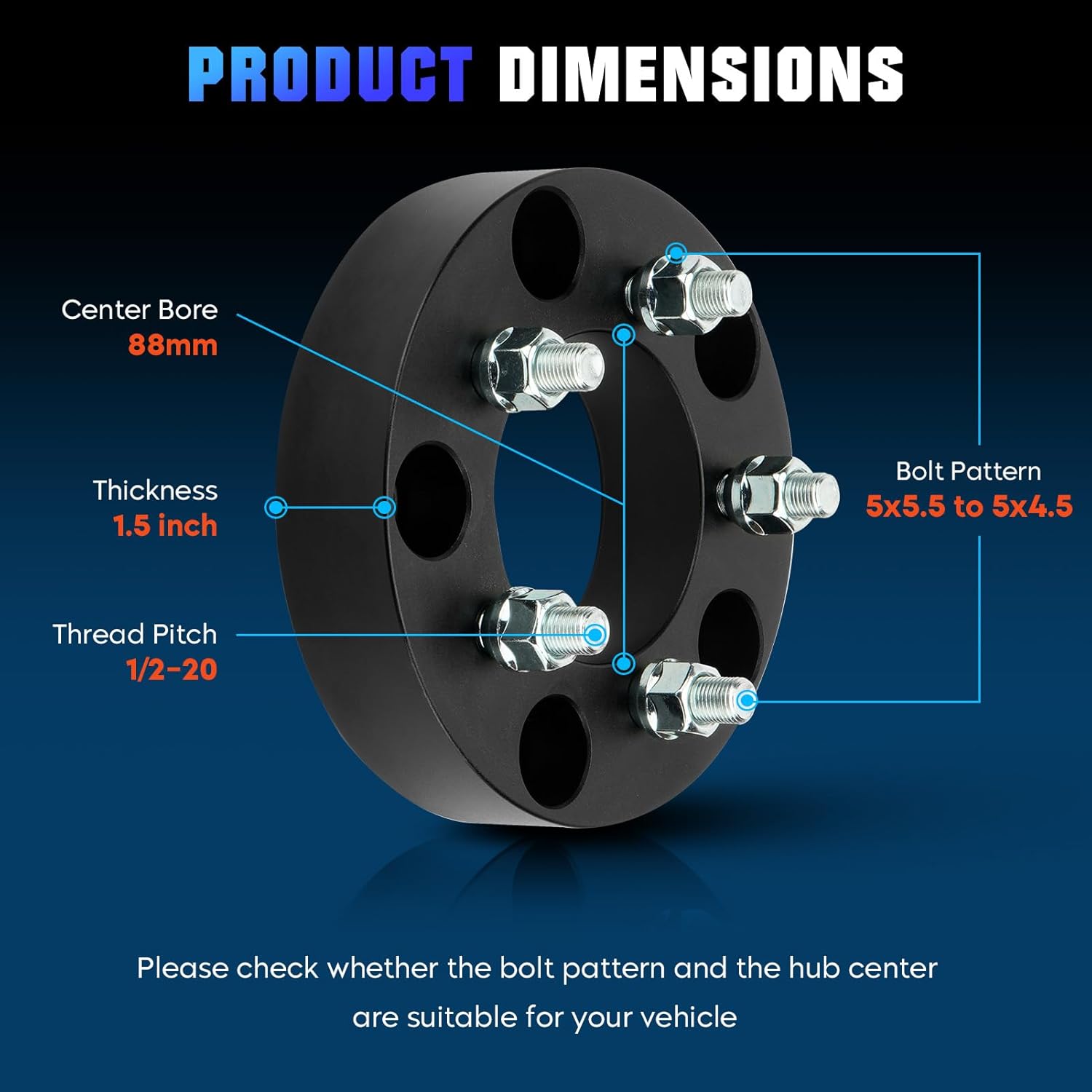 Specifications: Bolt Pattern: 5×5.5 to 5×4.5, Thread Pitch: 1/2-20, Thickness: 1.5”, Centre Bore: 88 mm, Quantity: 4 PCS Wheel Spacers.